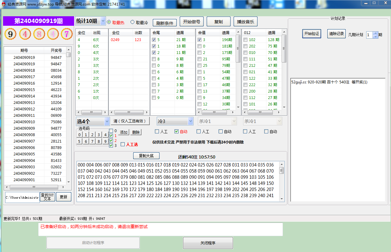 彩票无神,各位做研究参考只用,软件每次打开可运行8小时,需要无限制版请购买卡密需要无限制版请购买卡密,更多计划请登录:经典资源网.com 或者 www.aardio.top