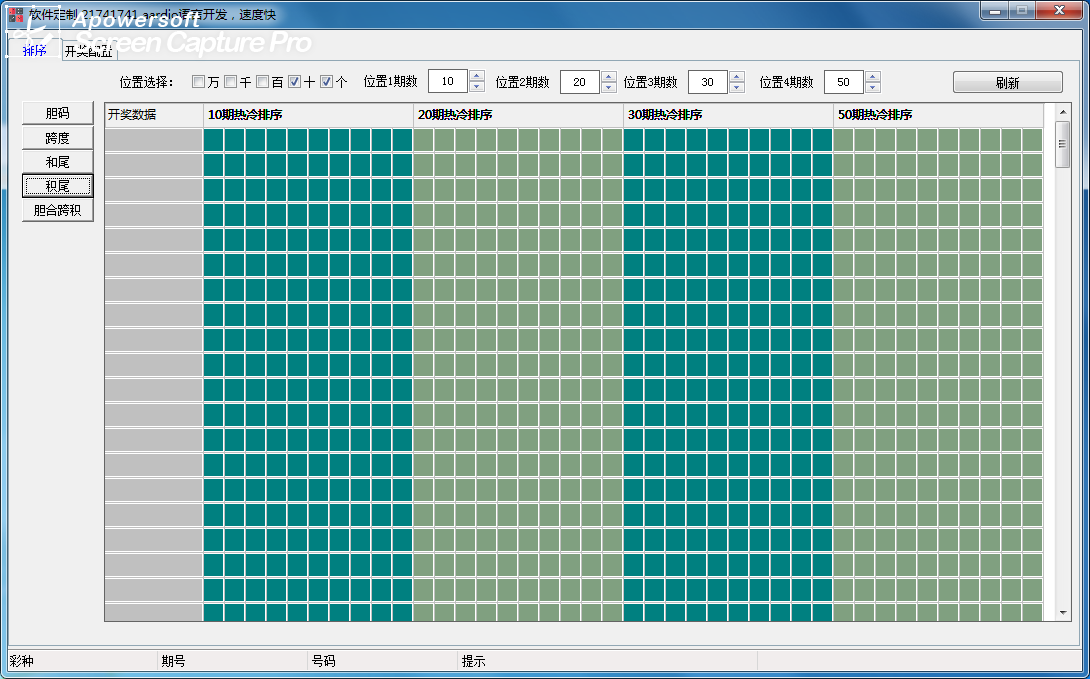 本软件已经完美破解,可以无限制使用,免费分享给大家测试 软件支持分分彩/时时彩系列彩种,需要外接挂机方案开奖文本 支持K线找号,玩法为四星任意位置,测试大概率和中概率的稳定性...