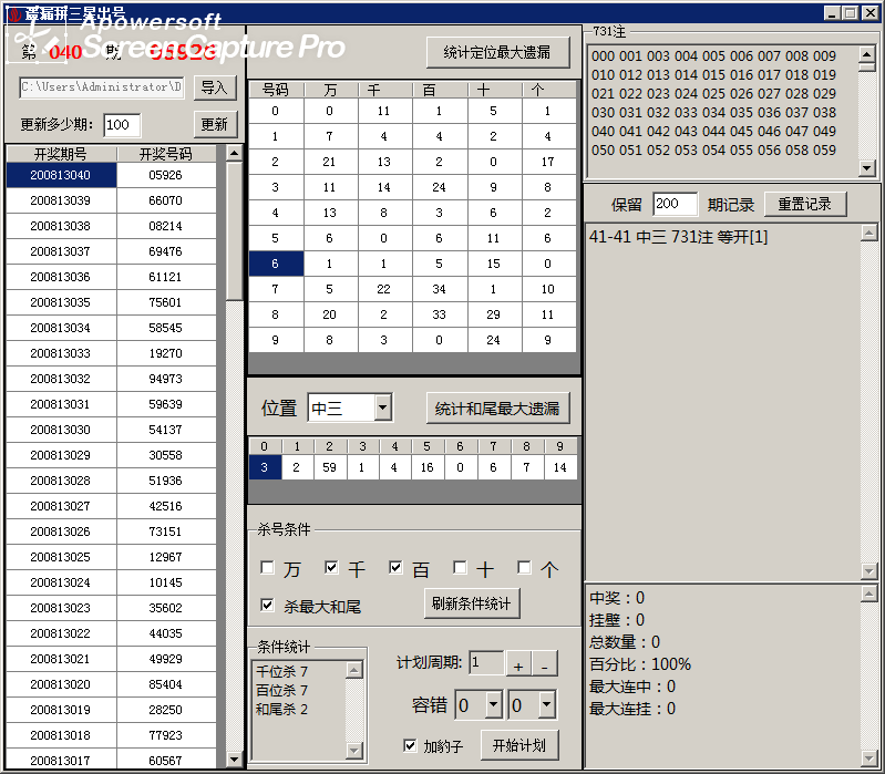 本软件支持的条件较多,如果不是特别懂的朋友建议条件用少点,否则弄巧成拙 支持任三全位置拼接五星出号功能,软件需要对接彩票自动投注开奖TXT文本配合使用 本软件需要一定的时间...