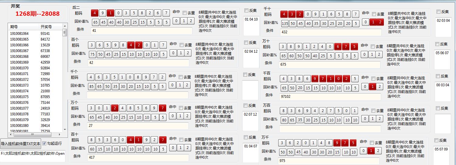 本计划为任二胆码回补率自动做号计划,所谓回补率,就是用历史遗漏值加上理论出次值套入概率公式简化所得,彩票无神,各位做研究参考只用,软件每次打开可运行10小时,需要无限制版请购买卡密, 更多计划登录:http://www.jdzyw.top